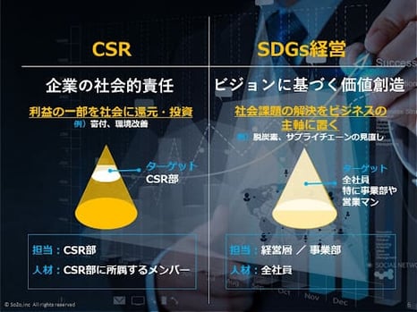 ▶SDGsはESGやCSRと異なり、社会還元や悪影響を及ぼさないことではなく、社会課題の解決をビジネスの主軸に置くことがSDGsである。