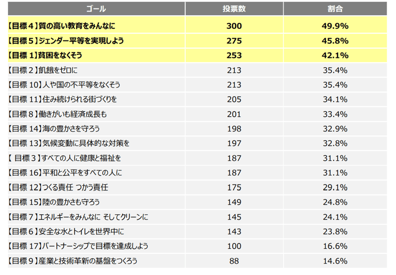 さらには、「興味のあるSDGsの目標を教えてください(複数回答可)」という問いに対しては半数の学生が「目標4 質の高い教育をみんなに」と回答。続いて「目標5 ジェンダー平等を実現しよう」「目標1 貧困をなくそう」が40%台となりました。