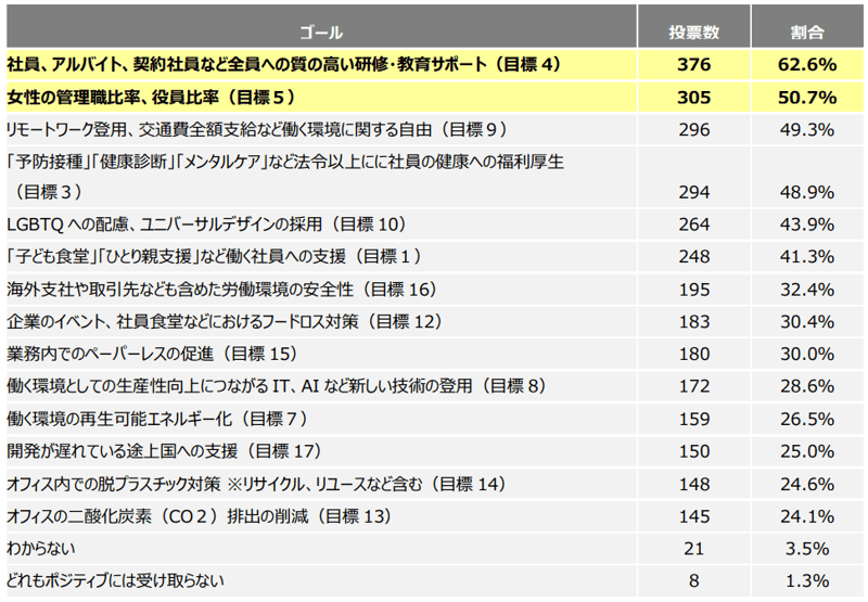 「働くときに福利厚生や環境整備として対策されているとポジティブに受け取る目標があったら教えてください(複数回答可)」という問いの1位はまたもや目標4。「質の高い教育をみんなに」――すなわち「社員、アルバイト、契約社員など全員への質の高い研修・教育サポート」に60%以上の学生が回答。2位は目標5に該当する「女性の管理職比率、役員比率」となりました。